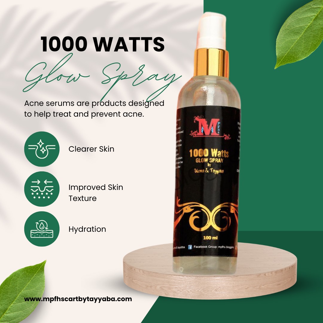 1000 watts spray is a rejuvenating mist toner infused with herbal and botanical extracts it tone and brighten skin for a healthy radiance. while natural moisture factors condition and help skin retain healthy hydration levels and it can be used in makeup and will give u the glowy flawless finish.